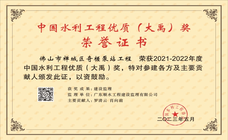 中國(guó)水利工程優(yōu)質(zhì)(大禹)獎(jiǎng)-佛山市禪城區(qū)奇槎泵站工程