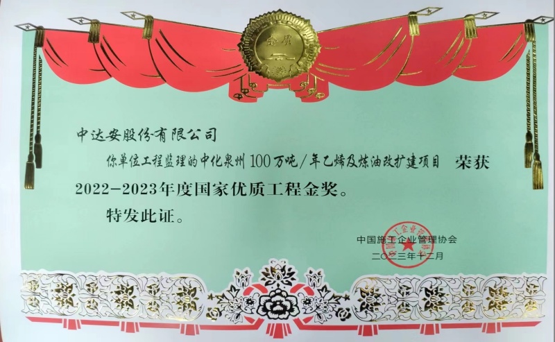 國(guó)家優(yōu)質(zhì)工程金獎(jiǎng)-中化泉州 100萬(wàn)噸年乙烯及煉油改擴(kuò)建項(xiàng)目