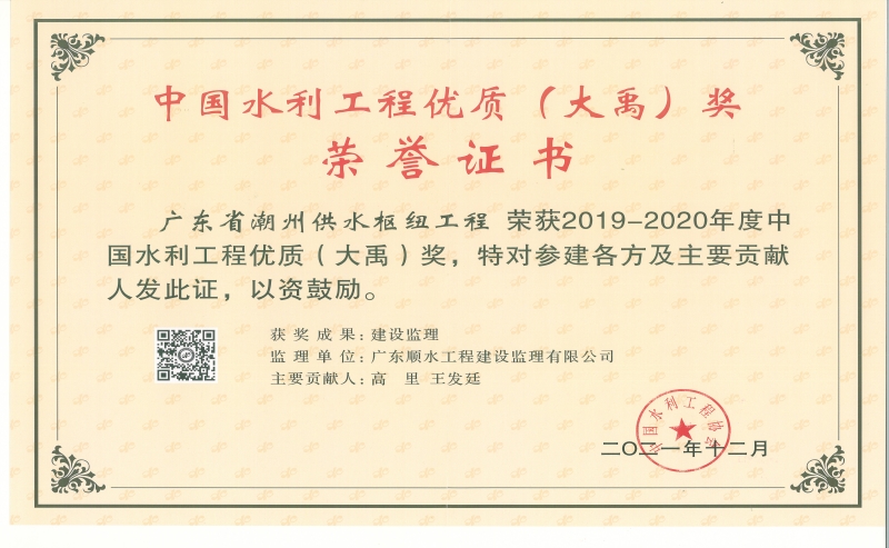 中國(guó)水利工程優(yōu)質(zhì)(大禹)獎(jiǎng)-潮州供水樞紐項(xiàng)目