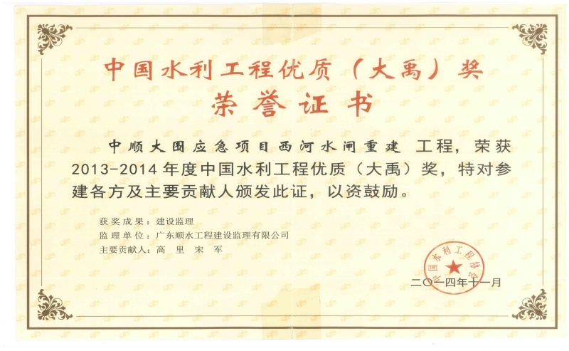 中國(guó)水利工程優(yōu)質(zhì)(大禹)獎(jiǎng)-中順大圍應(yīng)急項(xiàng)目西河水閘重建